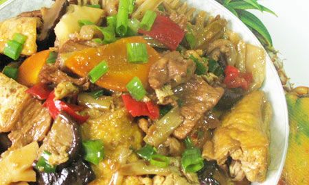 竹笋,干香菇,胡萝卜,葱段,红辣椒一个。