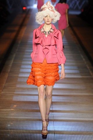 粉红色褶皱大领上衣搭配橙色雪纺层层荷叶边半裙,佩戴上大串珠宝项链,以及银白色卷曲假发,带来浓厚英式复古风情。