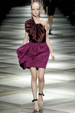 绛紫色廓型短裙搭配棕红色丝绸褶皱单肩上装,有评论家说Lanvin仍然带来“黑色日子”里雍容华贵的亮丽女人,不过这并没有不合时宜,因为这正是女人永远不变的诉求。