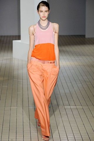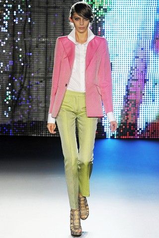 正因为金融海啸,所以设计师才要带来些明媚的色彩来振奋人心,Sinha-Stanic就是这样做的,蔷薇粉的带垫肩西装外套与如新生绿叶般翠绿的修身西裤相搭配,为英国时装周带来积极的希望之光。