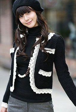 秋冬时节的蕾丝自然不似春夏那样鲜亮明快,黑色、棕色等深色系的外套加上蕾丝花边低调的华丽登场。线条流畅、剪裁间接地针织外衣,领口、袖口等的蕾丝修饰,搭配短裤与靴子,轻松休闲之余,又有俏皮与娇柔的感觉。