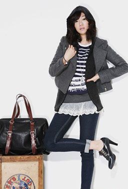 不一定整件都是蕾丝才叫时尚,其实只要有蕾丝元素的注入,就会令整体装扮女性化起来。小面积的运用反而更能体现MM的搭配功力,也可以让那些喜欢低调中性些的MM找到自己的感觉!领口露出的蕾丝装饰,令有些动感的装扮透露着女性特有的妩媚,蝴蝶结的胸针是韩国风格的表现!