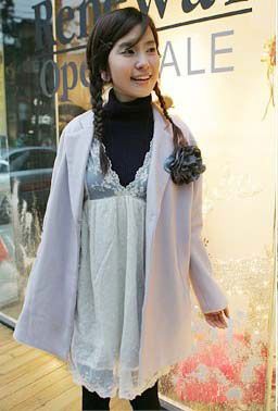 有些正式感的大衣下面的连衣裙让人带有惊喜,领口和下摆露出的蕾丝带有那种清新的诱惑,和贵族正统中有些休闲俏皮的情调,让性格文静优雅的淑女们怎能抵挡。和底色相同的蕾丝装不张扬相比,黑底上的白色蕾丝张扬着一种华丽的感觉!