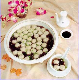 2、将鱼丸连清水倒入锅内,先用旺火煮,使表层快熟成形,当水温近八成热时,改用中火至烫熟取出,锅内倒入上汤,煮沸,放入鱼丸,煮至浮起,即端离火炉,撇去浮沫,加入紫菜(先烤火、拍去沙)、味精、胡椒粉、芝麻油、鱼露、猪油,起锅装入汤窝使成。