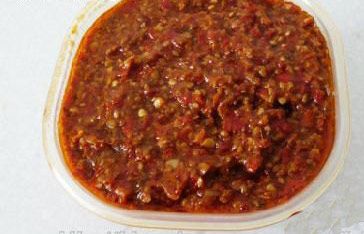 牛肉馅1斤、红辣椒1斤、干黄酱1盒、蕃茄酱半盒、白糖半斤、姜半斤、蒜1斤、五香花生半斤、熟芝麻二两、味素1两、盐少许。