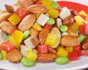 杏仁50克,毛豆仁50克,豆干50克,黄菜椒50克,红菜椒50克,大蒜片3克,鲜姜片3克,生抽5毫升,芝麻香油5毫升,鸡粉3克,白砂糖3克,盐3克,色拉油20毫升