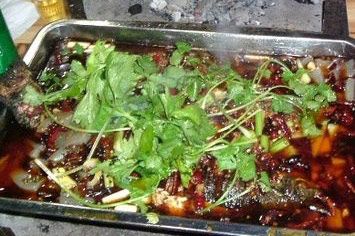 3.如此三五个回合,鱼肉莹白如玉脂。鱼本身用盐、葱水浸泡过,(烤的时候在鱼身上摸盐,最重要的是在鱼肚里放泡椒,芹菜等)所以一边烤一边会有鱼肉香。时间的掌握很重要,烤的时间长了,肉就不嫩了。