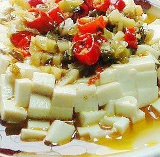 豆腐放锅中蒸5分钟,晾凉切小丁,酸菜泡椒榨菜切末,加调味料拌匀浇在豆腐上