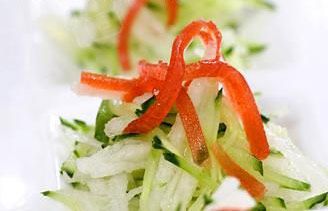 原料: 黄瓜1根 梨1只 金糕1块(也叫山楂糕)盐1/4茶匙(盐)蜂蜜1汤匙(15ml)