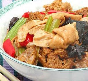 做法: 1,锅烧热,凉油,下八角和姜片,中火煸出香味。 2,倒入烤麸,花生,豆腐结,木耳翻炒均匀。调入适量糖,黄酒,再加入没过的水,盖盖儿,焖15分钟。 3,倒入口蘑,芹菜,红椒,调入蚝油和老抽,翻炒均匀后稍焖一下下即可加少许盐和鸡精。准备出锅