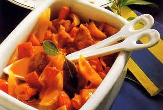 2、锅中热油,将牛肉放进煎锅,煎5分钟。加入洋葱后,继续煎5分钟。接着放甜椒,再加热5分钟,之后把月桂、柠檬皮和蒜放进锅中。最后倒入番茄糊,搅拌一番,小火煮5分钟。