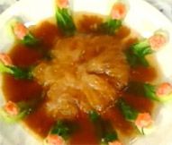 8. 炒锅置旺火,下猪油烧热,放入面粉煸至乳白色时,倒入白汤煮沸,调以酱油、味精,徐徐浇在鱼翅上,再铺上蒸热的火腿片即成。
