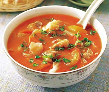 盐 适量 [制作流程] (1)排骨腌3~5分钟,然后油炸至金黄。蕃茄切块。 (2)蕃茄、小鱼干、文蛤与排骨一同放入焖烧内锅,加适量水煮开后,续煮3分钟,接着移入外锅焖1小时。 (3)食用前加入1罐肉酱及少许盐调味即可。