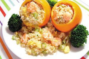 5、炒制香橙虾仁炒饭时,不可加入酱油调味,否则会让米饭变黑,盖住橙汁的甜味,也会让成菜不美观。