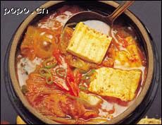 2.豆腐切成6厘米长、3厘米宽、1厘米厚的长方块,用开水煮5分钟,移至微火上待用。