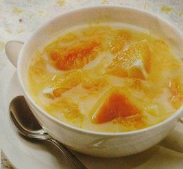 做法: 功效:南瓜富含维生素A,能强化粘膜,防止皮肤干燥。 1、南瓜洗净切成小块,橙子剥皮切成8份。 2、将水倒入锅中煮沸,放入切好的南瓜和橙子,盖上锅盖,小火煮5分钟,再倒入纯牛奶,煮开即可。 3、根据自己的口味放入盐,胡椒。喜欢甜品的朋友可以自己喜欢的糖。