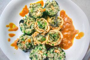 1.肉馅下锅炒出香味,加入适当的盐 2.鸡蛋划液,加盐,煎成蛋饼备用 3.按照包寿司的方法,或用蛋饼做皮或用寿司海苔,卷起来,切成小块,装盘。 4.勾芡咖喱粉少许,加入白醋适量