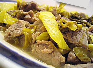3、锅中留油,将配料、酸菜片放入锅中炒香,放入牛肉炒匀,淋入绍酒随即把碗芡倒入炒匀,淋入麻油上碟即可。