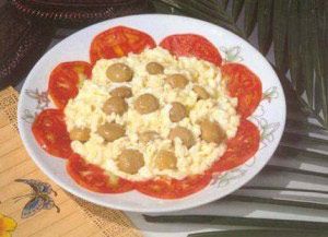 用料:鲜奶150克,蛋清150克,鲜蘑菇50克,蕃茄1只