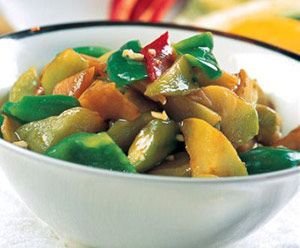 3、锅中放少量油,放葱花、蒜片爆香,将三种蔬菜一起倒入锅中,加生抽、糖、盐翻炒均匀,酌量加高汤大火煮一分钟;