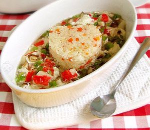 3 、饭蒸好后再来炒滑蛋蟹棒,炒锅内加入少许油,烧热后依次放入蟹棒、香菇、芹菜,煸炒一会,加入盐,倒入高汤煮开片刻,用水淀粉勾薄芡,再倒入蛋清液拌炒几下,放入胡椒粉拌炒均匀就好了。
