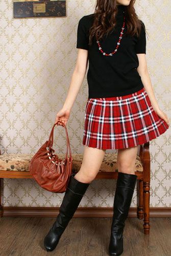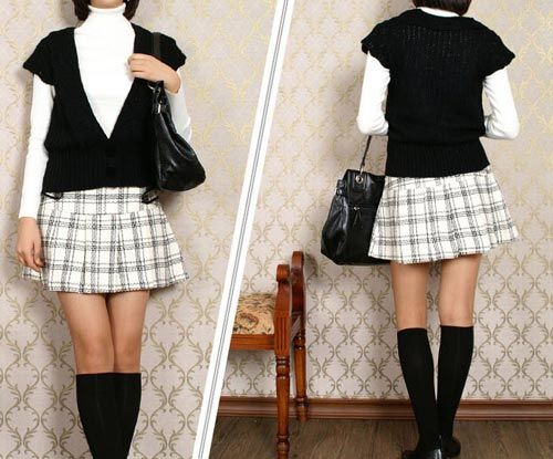 黑色休闲背心搭配亮丽格纹短裙,清纯的风格最适合乖乖女生