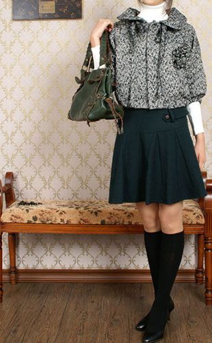 黑色短款毛衣搭配烟灰色百折短裙,平添一分妩媚的风情