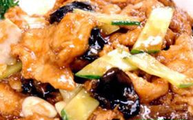 13. 炒锅再放回火加入猪油,放入葱片、姜末、蒜片煸出香味,扣入过好油的肉片,先用醋烹一下再倒入调好的芡汁,颠翻炒匀,淋猪油即可出锅。