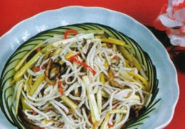 (3)烧热炒鼎倒入生油,待油烧至七成热时,投入肉丝炒散,随即将鱼面倒入热油中溜后,即倒入笊篱沥干油分,在原热鼎内放入少许油,投入冬菇、豆芽菜、笋、芹菜丝一起炒香,再将肉丝、鱼面投入、烹入料酒,倒入芡汁,颠翻几下,起鼎装盘,撒上方鱼末即成。
