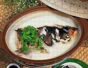 2、砂锅置旺火上烧热,至八成热(约1760℃)时将鱼头正面下锅煎黄,加入酱油和绍酒、白糖,推匀后将鱼头翻身,再加上汤和清水500克,放入豆腐、笋片、香菇、姜末,烧沸后倒入砂锅中,移小火上炆15分钟,再用中火烧2分钟,撒去浮沫,加味精、青蒜,淋上熟猪油25克,将砂锅置底盘上桌即成。