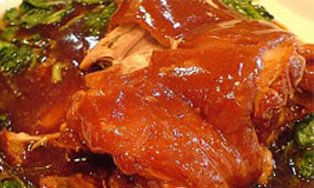 3)加进料酒、酱油、花椒、大料、盐,再上屉蒸约2小时,把肘子蒸烂取出,控去水分;