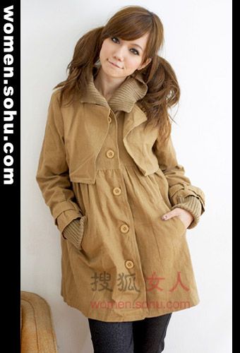 时尚解析:俏皮的假两件式卡其色风衣,毛线收口的设计充满温暖气息。高腰的设计藏起腹部赘肉,可爱的设计让你瞬间年轻十岁。