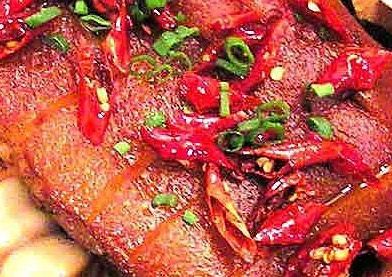 (2) 把姜拍疏,葱切3厘米长段。把腌雪里红梗除去根梢,切成2厘米长段以后,用凉水洗净,稍干后用油炸焦待用。