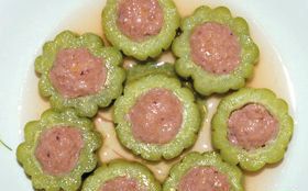 主料:苦瓜500克,猪肉(肥瘦)250克,虾仁120克