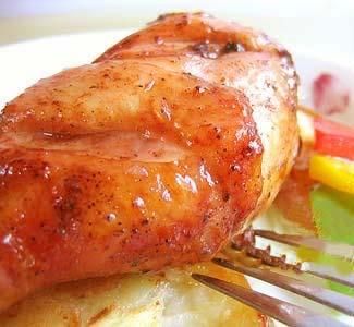 5. 将烤好的鸡与蔬菜置于大碗中,加白酒至烤盘中,与鸡汁、余油混合,以中火加热搅拌1分钟成酱汁。将酱汁倒入碗中鸡块上,略微搅拌后即成。