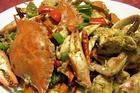 3.锅内另加油,烧至四成油温,投入干辣椒节,花椒炒香,掺入鲜汤,略烧片刻,再下姜、葱蒜、海蟹,最后放入精盐、料酒、海鲜酱、鸡精烧约2分钟后,用水淀粉收薄芡。