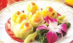 3、猕猴桃盅内放入虾仁、猕猴桃肉,淋上A料,即可盛出。