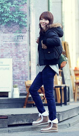 搭配点评:深色系的搭配适合内敛的你。戴帽小棉衣,深蓝色铅笔裤,mou雪地靴,款款都是衣橱必备单品,精彩不容错过.