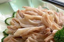 5. 鸭掌煮至七成烂捞出,剔去骨,趁热用辣椒油、味精、白糖、精盐10克、蒜瓣5 克(拍碎)拌匀,堆放在盘中间。