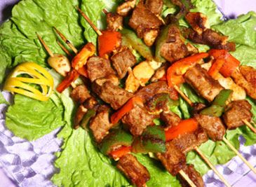 5.将上述材料以及彩椒穿串,做8个肉串即可